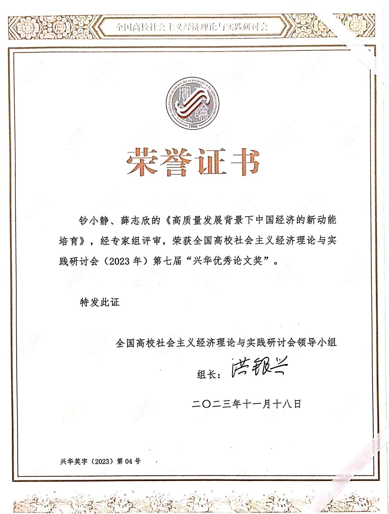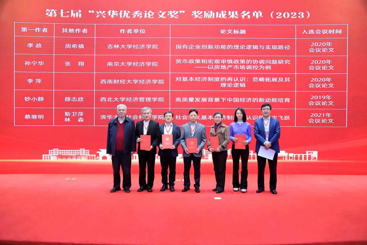 2023年11月18—19日,第36届全国高校社会主义经济理论与实践研讨会在西南财经大学召开。本次会议,刘伟教授宣布了第七届“兴华优秀论文奖”共有五篇论文(9位学者)获奖,由洪银兴教授为获奖代表颁奖。永利yl23411no1钞小静教授和薛志欣博士的会议论文《高质量发展背景下中国经济的新动能培育》荣获第七届“兴华优秀论文奖”。论文在新一轮技术革命背景下,探讨新经济如何重塑中国经济高质量发展的新动能。