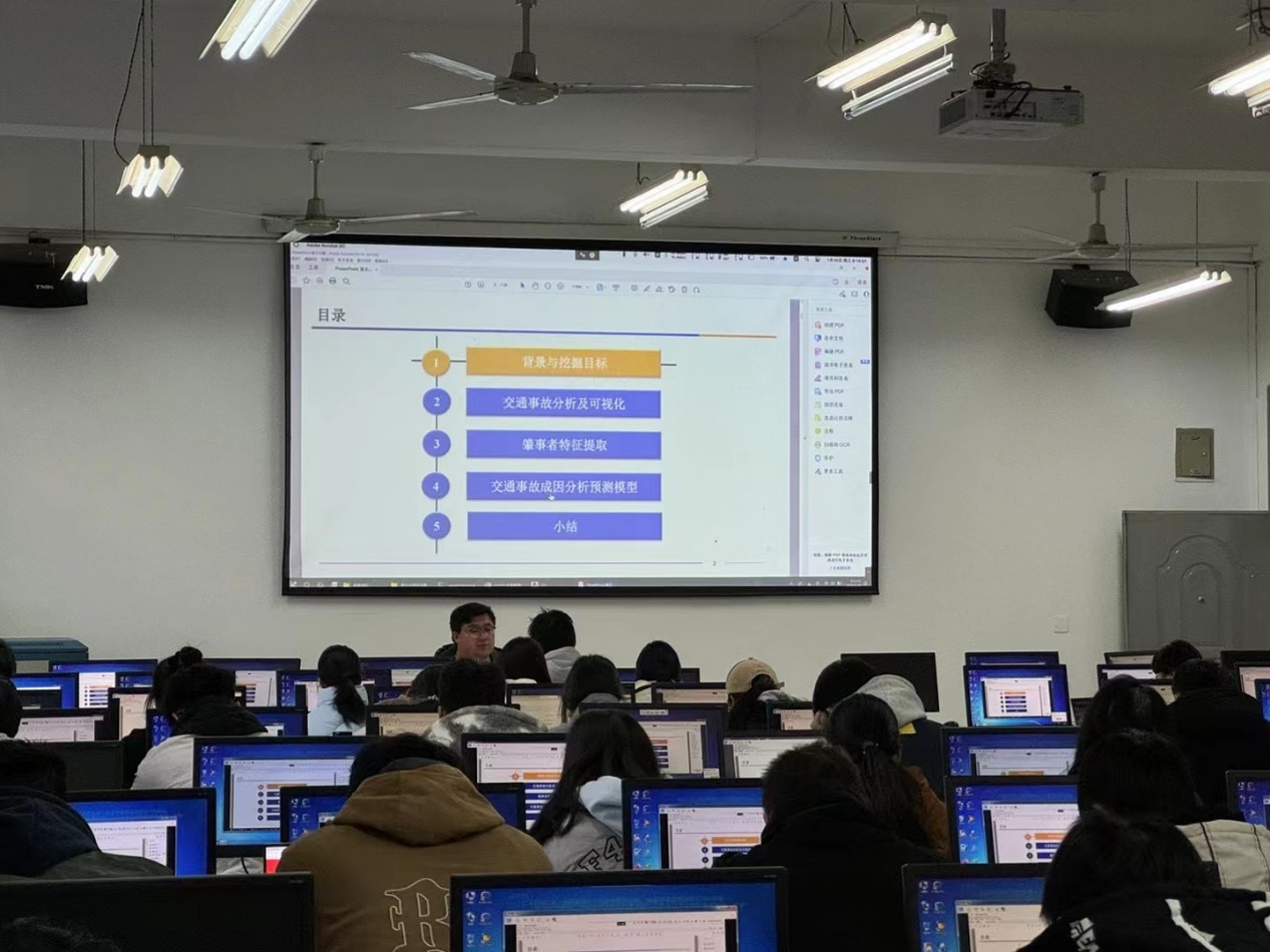 大数据分析实训活动中,信管系邀请了陕西众望新橙教育科技有限公司讲师梁霄在8110教室给信管专业21级、22级、23级的本科生进行了关于Python数据分析及应用的课程培训。实训以交通领域的多维真实数据为基础,深度挖掘交通事故成因分析,车辆驾驶行为安全分析。通过对真实案例的数据分析让信管专业的学生们充分熟悉数据预处理、数据分析、数据可视化等阶段所需的知识和技能,并对大数据分析的应用价值有直观的感受。