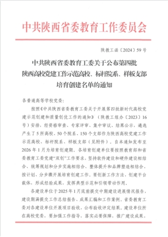 近日,省委教育工委公布了第四批陕西高校党建工作示范高校、标杆院系、样板支部培育创建名单。永利官网党委入选全省党建工作标杆院系培育创建单位名单。截至目前,永利官网已有1个党支部入选“全国党建工作样板支部”培育创建单位名单,2个党支部入选全省高校党建“双创”样板支部建设名单。