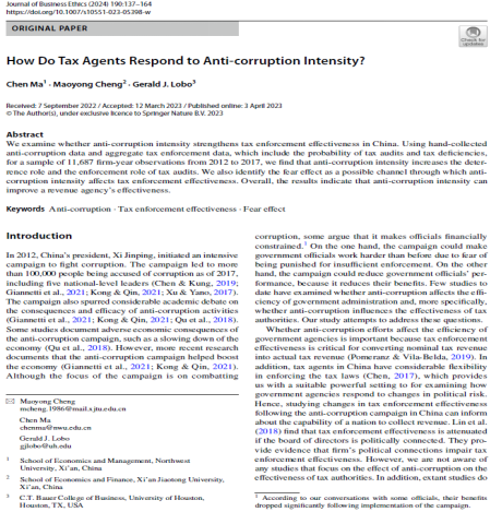 近期,永利官网供应链会计与审计团队的马晨教授与西安交通大学经济与金融学院的程茂勇教授、美国休斯顿大学的Gerald J. Lobo合作的论文《How Do Tax Agents Respond to Anti‑corruption Intensity》,在FT50权威期刊《Journal of Business Ethics》发表(ABS 4;JCR一区;近五年影响因子8.1)。