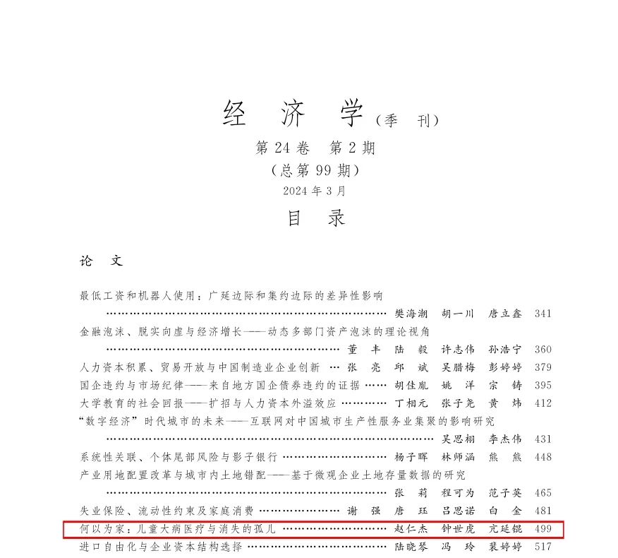 近日,永利官网经济学系赵仁杰副教授以第一作者身份的研究成果《何以为家:儿童大病医疗与消失的孤儿》一文在《经济学(季刊)》2024年第2期发表,文章研究了政府实施的儿童大病医疗保障政策对缓解社会孤儿问题的重要作用。