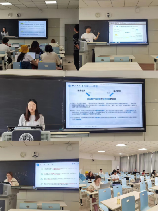 “基地学术课堂”的第一单元为现代经济学理论与方法创新论坛第二十一卷第六期,由2022级理论经济学专业硕士研究生李雪珂进行了题为《企业数字化转型对绿色创新的影响》的报告。本次汇报响应国家高质量发展的战略要求,关注时代热点话题企业数字化转型与绿色创新,并利用实证分析探究了两者之间的影响方式和作用机理。