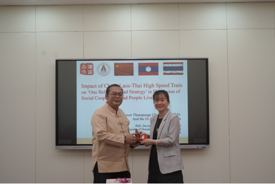 座谈中,马莉莉教授对泰方来访表示欢迎,并对中泰友谊、学院历史及对“一带一路”的研究成果等方面进行了回顾。Thanapauge Chamaratana教授随后介绍了本次调研活动的基本情况。本次来访是“The Impact of the China-Laos-Thai High-Speed Train on the‘One BeltOne Road Strategy’in the Dimension of Social Cooperation and People’s Livelihoods”研究项目的一部分,致力于通过调查“一带一路”倡议背景下中国、老挝、泰国高速铁路对社会合作与人民生活的影响,旨在提出有助于提高人民福祉的政策建议。该项目得到“澜湄合作专项基金”的支持。