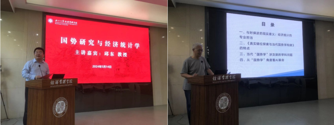 5月14日,江西财经大学统计与数据科学学院讲席教授、教育部长江学者特聘教授邱东教授和天津财经大学教授、河南大学特聘教授、国家教学名师、国务院特殊津贴专家肖红叶教授分别做客永利官网“侯外庐学术讲座”第三百五十四讲和第三百五十五讲,在永利yl23411no18318会议室分别做了题为《国势研究和经济统计学》和《数据的要素演化逻辑探索》学术讲座。讲座由校党委常委、副校长吴振磊主持。学院近百名师生参加本次讲座。