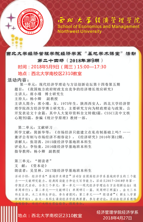 永利yl23411no1永利yl23411no1经济学系“基地学术课堂”活动第二十五场(2018年第9期)