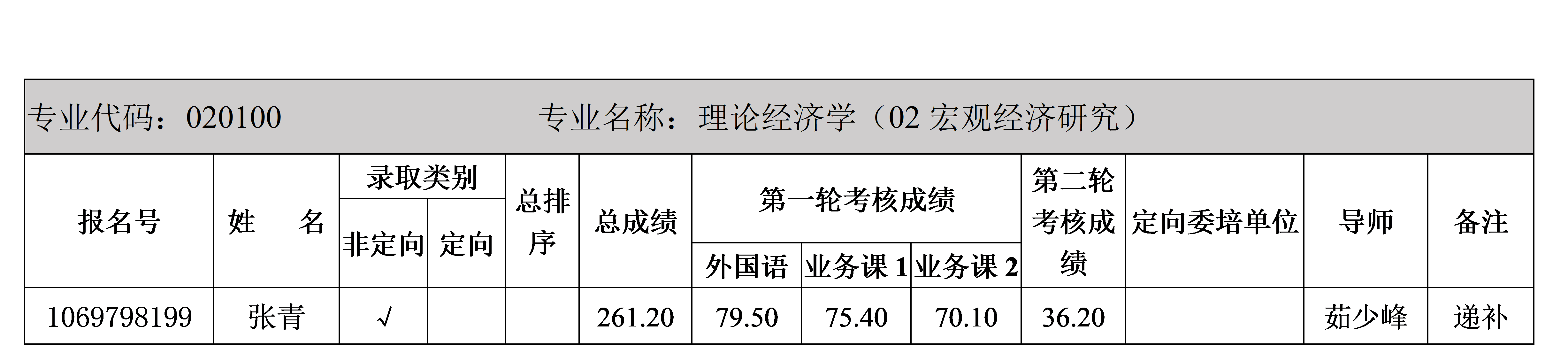 根据《永利yl23411no12020年博士研究生招生录取办法》和《永利yl23411no12020年博士研究生招生录取工作方案》的要求,因理论经济学宏观经济研究方向有1位拟录取考生自愿放弃,现递补1名,公示如下: