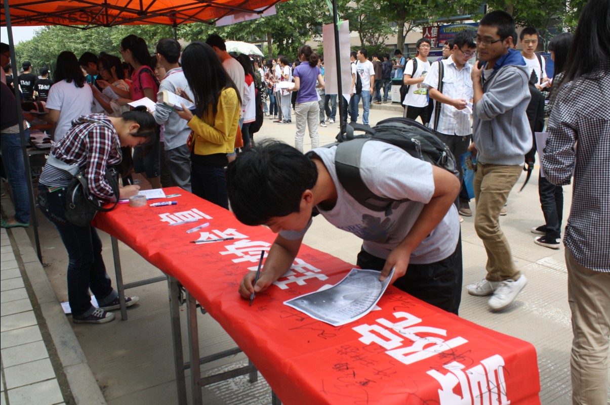5月25日中午,学院在长安校区一号教学楼前进行了 “5·25心理健康日”健康宣言签名活动,5月25日是全国大学生心理健康日,“5·25”的谐音即为“我爱我”,它的核心内容是:关爱自我,了解自我,接纳自己,关注自己的心理健康和心灵成长,提高自身心理素质,进而爱别人,爱社会。活动吸引了众多同学参与,大家纷纷在横幅上签下自己的名字,表达了自己的感悟。活动受到了良好的效果。