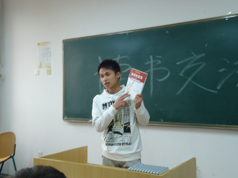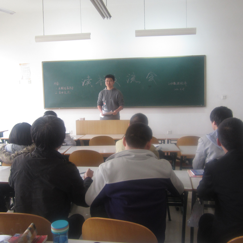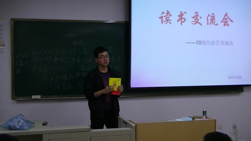 读书交流活动本着“激趣、导读、精悟、善写”的原则,以“净化学生心灵,升华学生人格”为出发点,以“润泽学生心灵”为目标。主要以学生主动上台向班级同学介绍在过去的两周时间里所阅读的书籍,畅谈收获和体会的形式进行,带动和辅导同学们读书与写作能力。交流的书籍包括经济类、管理类以及部分哲理故事类。