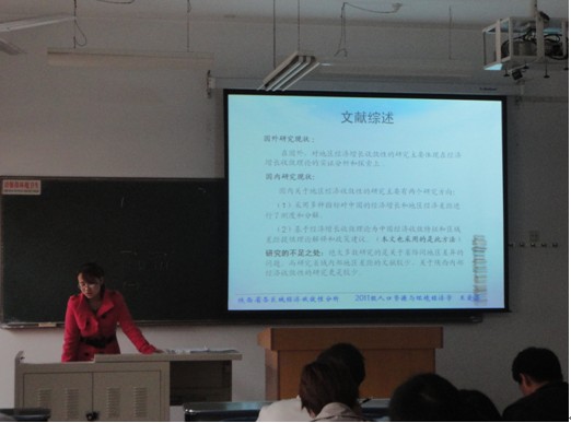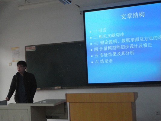 第二场获奖论文报告会于2011年11月10日16:00在1203教室举行,报告会由院研究生会学术部部长付晓平主持。11级硕士研究生王爱琴和10级硕士研究生周博就其获奖论文与同学们做了深入交流。王爱琴同学以《陕西省各区域经济收敛性分析》为题,运用三种收敛模型对陕西各区域经济的收敛性作了测度与分析,得出了陕西省三大区域经济发展差距逐步缩小的结论。周博同学的报告题为《我国官方统计数据质量问题研究—基于结构方程模型》,他运用结构方程模型对统计数据质量进行测度与分析,发现统计制度而非统计技术影响了数据质量。整个活动气氛十分活跃,同学们与主讲人之间的交流十分频繁,思想的火花在碰撞中爆发。