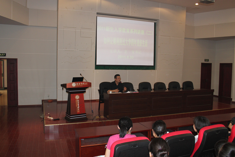 王宝书记首先对同学们到经管学院学习表示热烈的欢迎,对同学们和家长选择经管学院表示衷心的感谢。接下来王书记结合学院教授们的成功经历,教育同学们要树立远大的理想,追求上进,用先进的思想武装自己的头脑,把个人的成长发展和时代的要求紧密结合起来,为祖国的繁荣和民族的振兴做出贡献。其次,要热爱所学专业,端正学习态度,珍惜时间,刻苦学习,做到如饥似渴、废寝忘食、永不满足,为将来走向社会,服务人民打下坚实的基础。第三要模范遵守校规校纪,严以律己,尊重同学,关心同学,同学之间和睦相处,共同进步,热爱集体,积极参加集体活动,始终保持乐观向上的阳关心里,愉快度过大学美好的时光,做一名对祖国、对人民有贡献的合格大学生。
