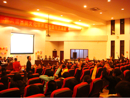 在开幕式上,同学们表演了丰富多彩的节目。由09国贸的几个女生表演的的舞蹈,拉开了开幕式的序幕,几个人虽然风格迥异,却用不同的风采展现了自己的个性,底下的尖叫声和闪光灯不断,刚一开始就将开幕式的气氛推向了高潮。紧接着文化节总负责人白露同学向到场的嘉宾介绍了本次国贸文化节特色,国贸系主任吴航老师宣布国贸文化节开幕。最后,09国贸女生的小合唱《一起走过》,使在场的所有人都沉浸在优美的歌声中,纷纷随着节奏鼓掌,台上台下一起合唱,小合唱似乎变成了集体大合唱。随后,主持人宣布知识竞赛开始。