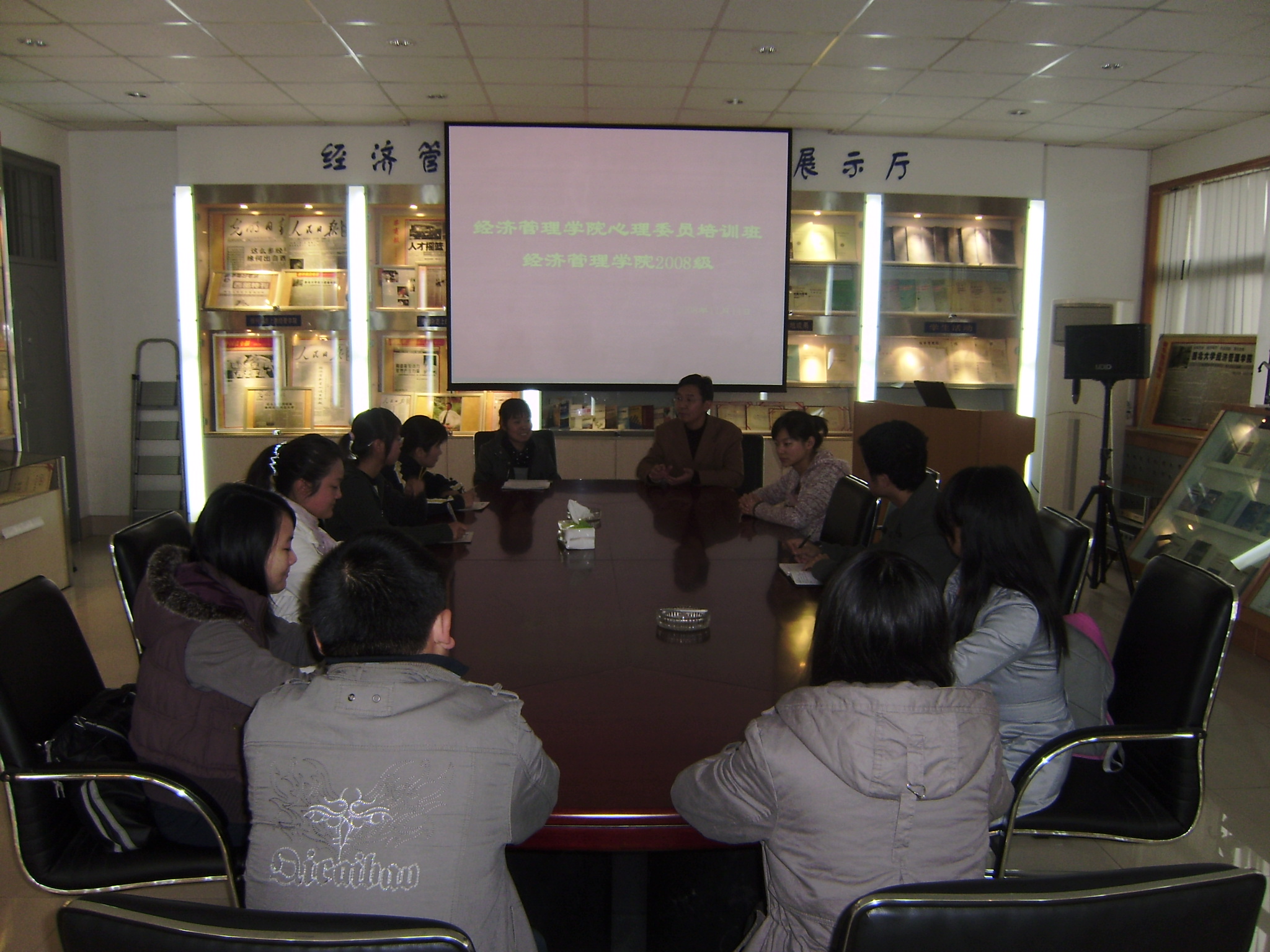 2008年11月14日下午,永利官网首届心理委员培训班在学院展室举办。学校心理咨询中心同雪莉老师应邀作专题辅导。开班仪式由团委副书记张冉冉老师主持。院党总支副书记樊涛老师出席开班仪式。