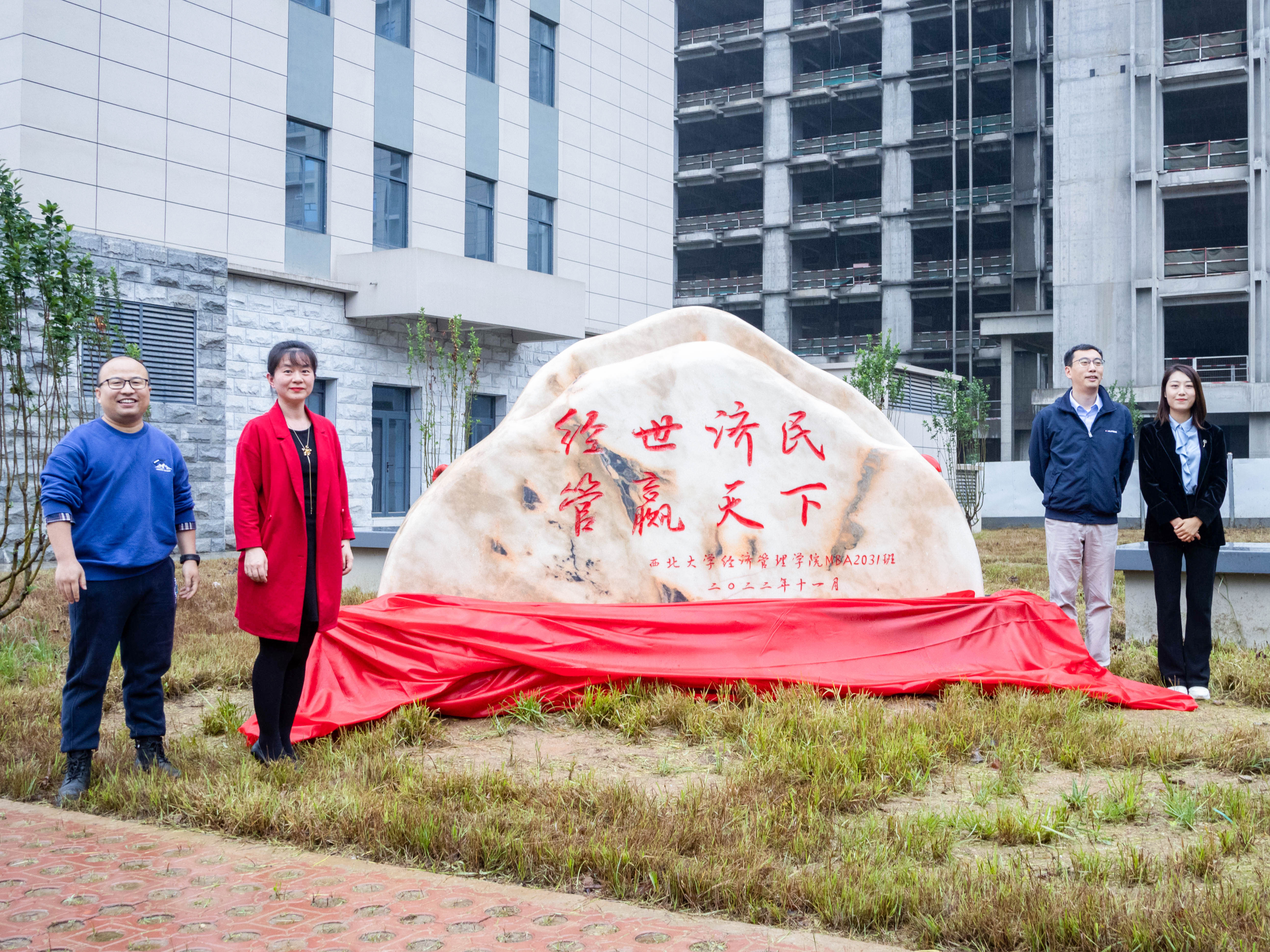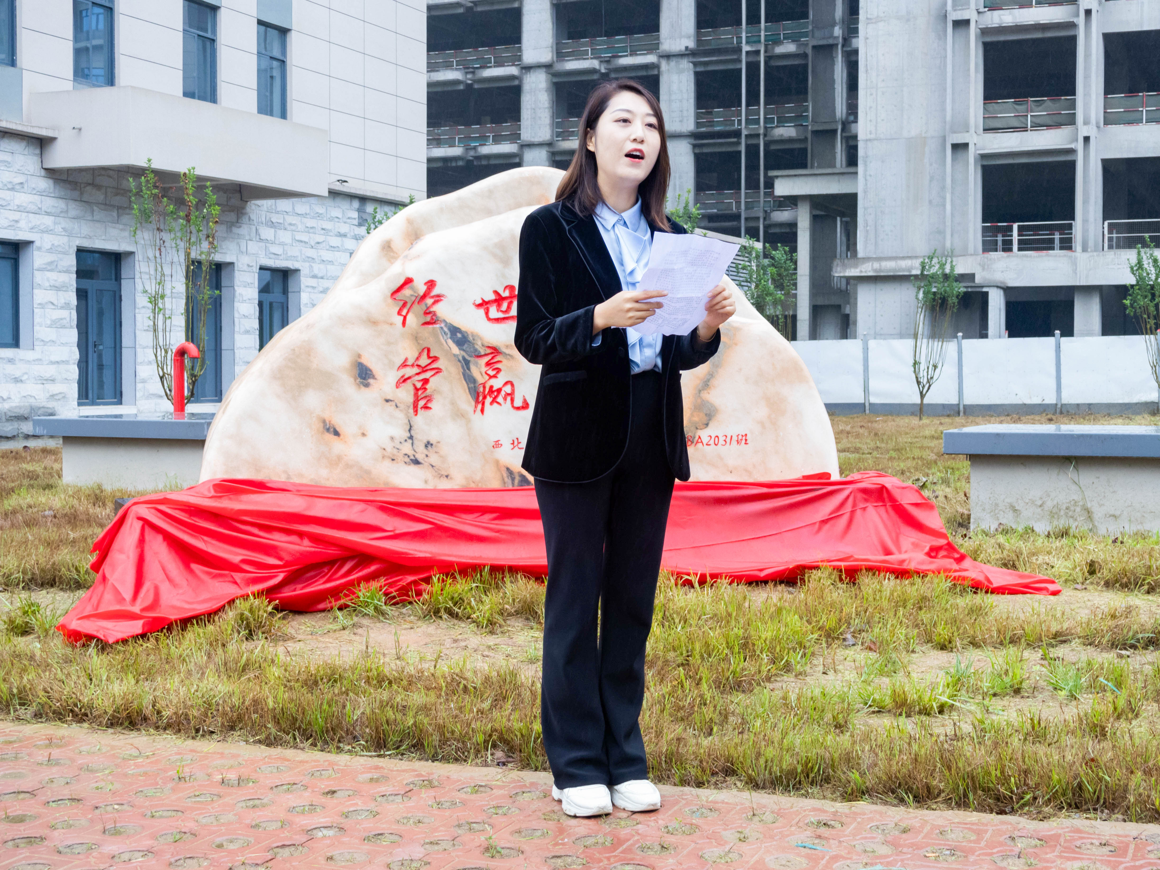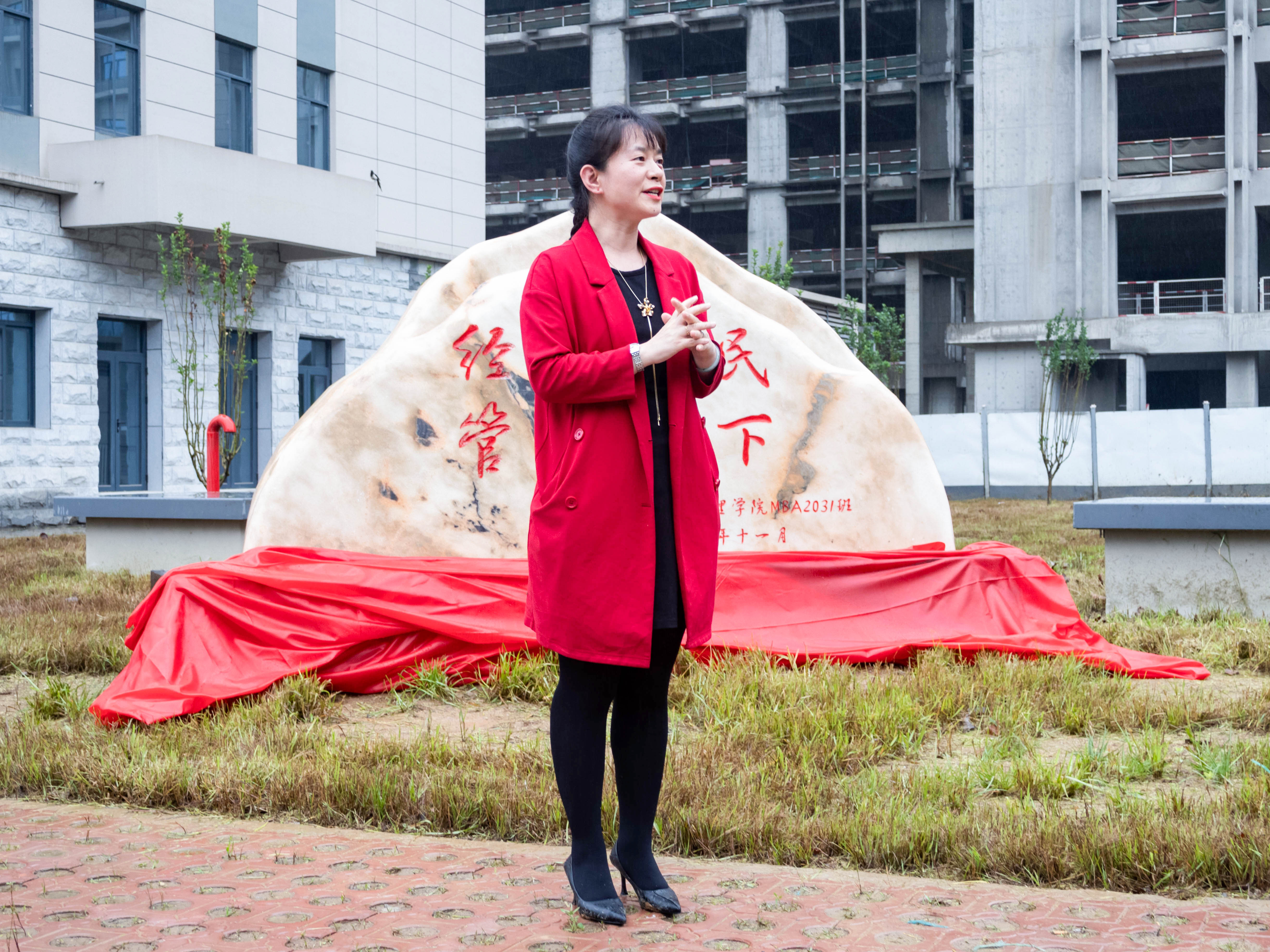 捐赠仪式上,学院马莉莉院长和校友工作办公室主任吴丰华,MBA2031班学生代表董雪、秦立服共同为景观石揭幕,国内合作与校友工作处副处长燕来为MBA2031班颁发捐赠证书。