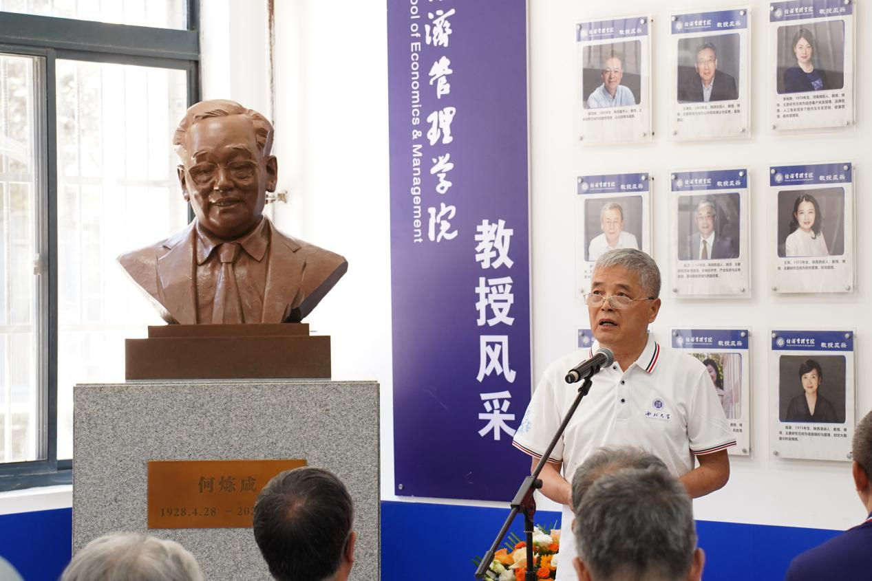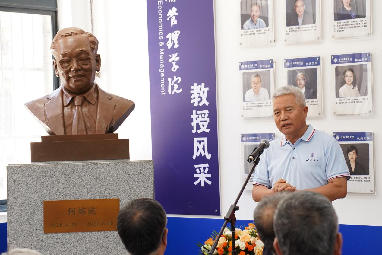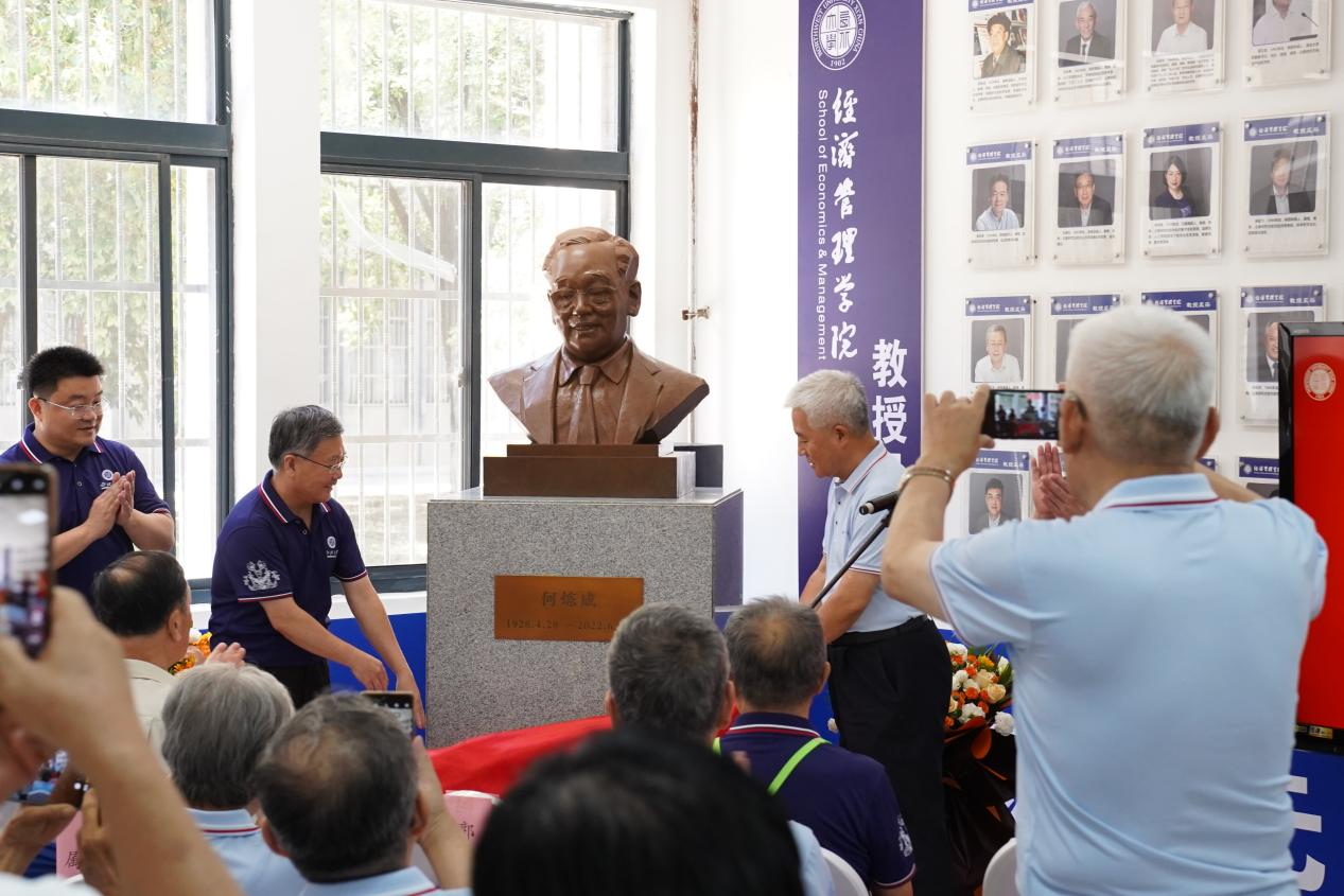 经济系77级杨立人校友发言表示,要学习先生“不唯上、不唯书、只唯实”的实事求是精神,学习先生一丝不苟、兢兢业业、认真负责的工作精神,学习先生埋头苦干、孜孜不倦、刻苦钻研的奋斗精神,学习先生博采众长、启智容错、激励思辨的教育精神,学习先生与时俱进、为国为民、创新立言的奉献精神。经济系78级刘旨贤校友代表全班深情诵读了自己创作的《何师铜像 揭幕吟唱》,表达了全班对何先生的深情怀念。经济系77级张维迎校友演唱自创信天游,一曲《何老师再听我一曲信天游》道尽了老师对学生的关心和扶持,倾诉着学生对老师的感怀和思念!经济系77级曾宣传校友诵读自创铭文,铭文以“悠悠长安,教泽汤汤。西大文昭,恩师宏光”起始,以“瞻念师范,慨当以慷。激励来者,学脉绵长”结尾,以抒缅怀。经济系77级叶世铭校友诵读对联:“炽烈情智源湘浏,铮骨铸就;绚烂文章涵磊襟,碧血炼成”,以表敬意。
