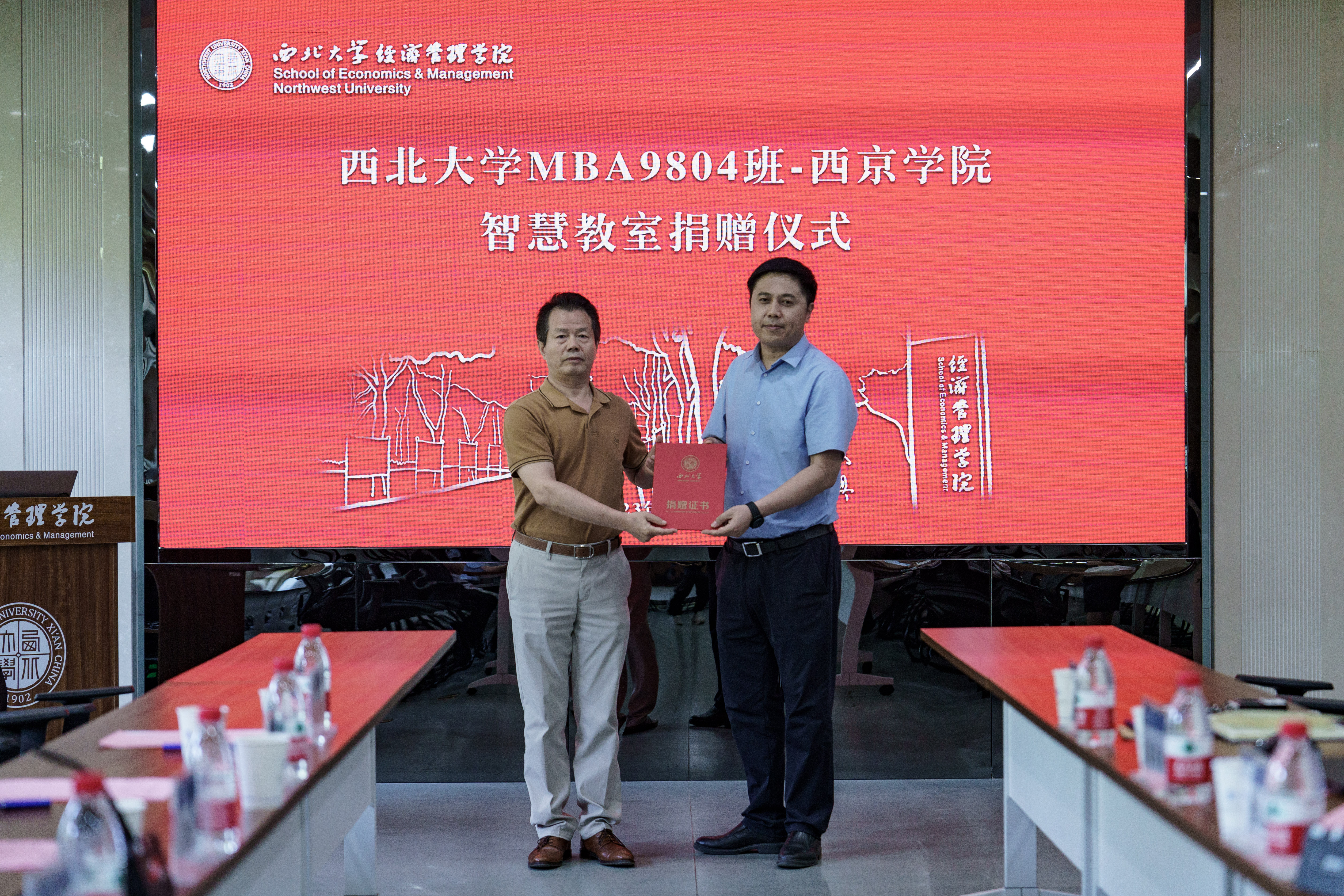 崔延力代表学校向MBA9804班和西京学院颁发捐赠证书