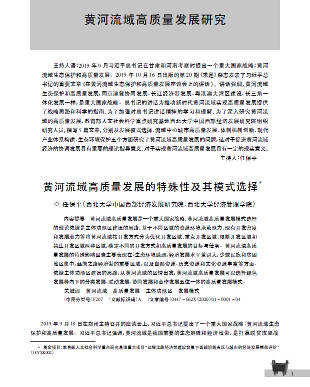 《新华文摘》2020年第7期全文转载永利官网任保平教授文章“黄河流域高质量发展的特殊性及其模式选择”,同时作为封面文章加以推荐。该文发表于《人文杂志》2020年第1期。 2019年9月18...
